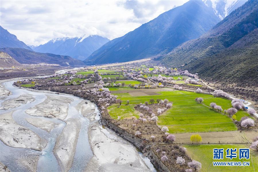 西藏林芝市波密縣境內桃花盛開的田園風光(無人機照片,3月26日攝)。新華社記者 晉美多吉 攝
