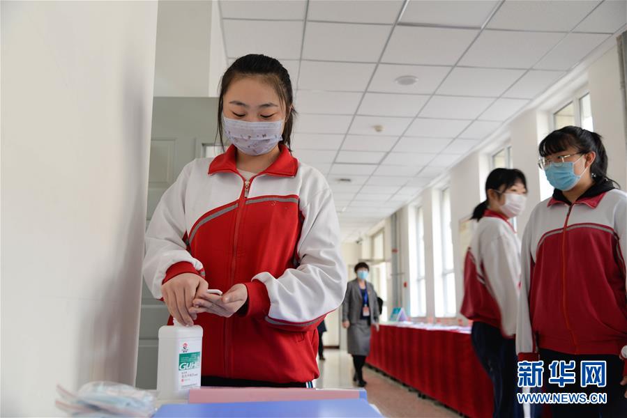 3月30日,學生在呼和浩特市第六中學教室外的走廊上使用免洗洗手液。當日,內(nèi)蒙古自治區(qū)全區(qū)高三和初三年級開學復課。新華社記者徐欽攝