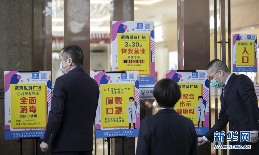 3月30日,在武商世貿廣場,工作人員在開門前布置標志牌。當日,武漢市多家商場開門迎客。新華社記者費茂華攝
