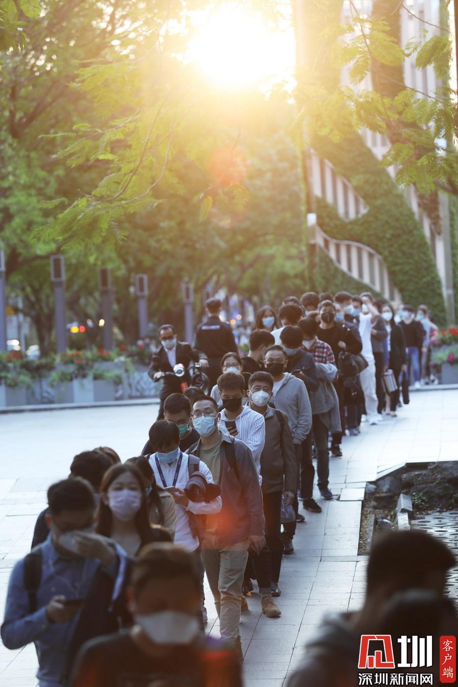 據(jù)悉,深圳地鐵實行客流管控,控制車站人員密度。由于下班高峰客流量較大,“人龍”排到一旁的科技園文化廣場,形成“蛇餅”隊伍,秩序卻十分井然。