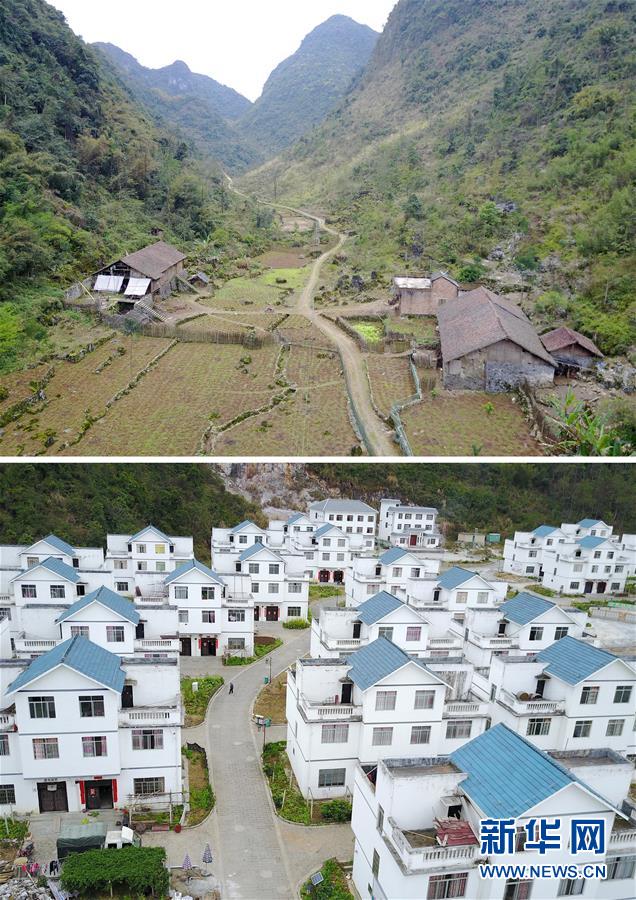 拼版照片:上圖為廣西環(huán)江毛南族自治縣大安鄉(xiāng)可愛村肯愛屯(無人機照片,2017年3月14日攝);下圖為廣西環(huán)江毛南族自治縣大安鄉(xiāng)可愛村移民新村(無人機照片,2017年3月14日攝)。