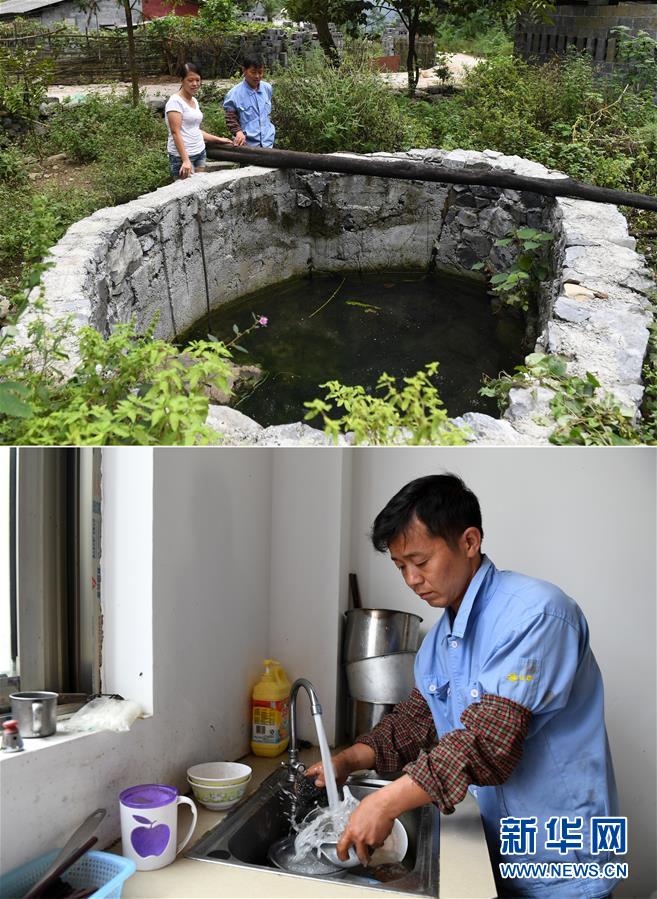 拼版照片:上圖為在廣西都安瑤族自治縣下坳鎮(zhèn)加八村龍力屯,袁朝強(qiáng)(右)和妻子羅蘭香站在水井邊(2017年10月12日攝);下圖為在廣西都安瑤族自治縣下坳鎮(zhèn)車(chē)家莊扶貧搬遷安置新區(qū),袁朝強(qiáng)在自家新房里使用自來(lái)水洗碗(2017年10月12日攝)。新華社記者陸波岸攝