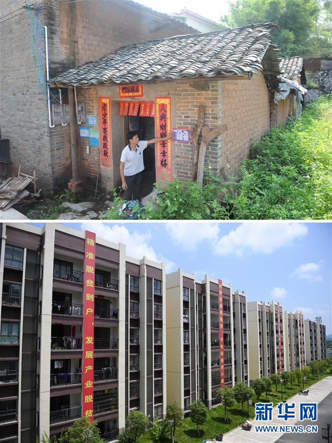 拼版照片:上圖為貧困戶(hù)楊金生站在位于廣西興業(yè)縣山心鎮(zhèn)蓬塘村的老宅門(mén)口(2018年8月24日攝,興業(yè)縣委宣傳部供圖);下圖為廣西興業(yè)縣易地扶貧搬遷安置小區(qū)“老鄉(xiāng)家園”內(nèi)的居民樓,貧困戶(hù)楊金生在這里有了自己的新房子(新華社記者曹祎銘2019年8月14日攝)。新華社發(fā)