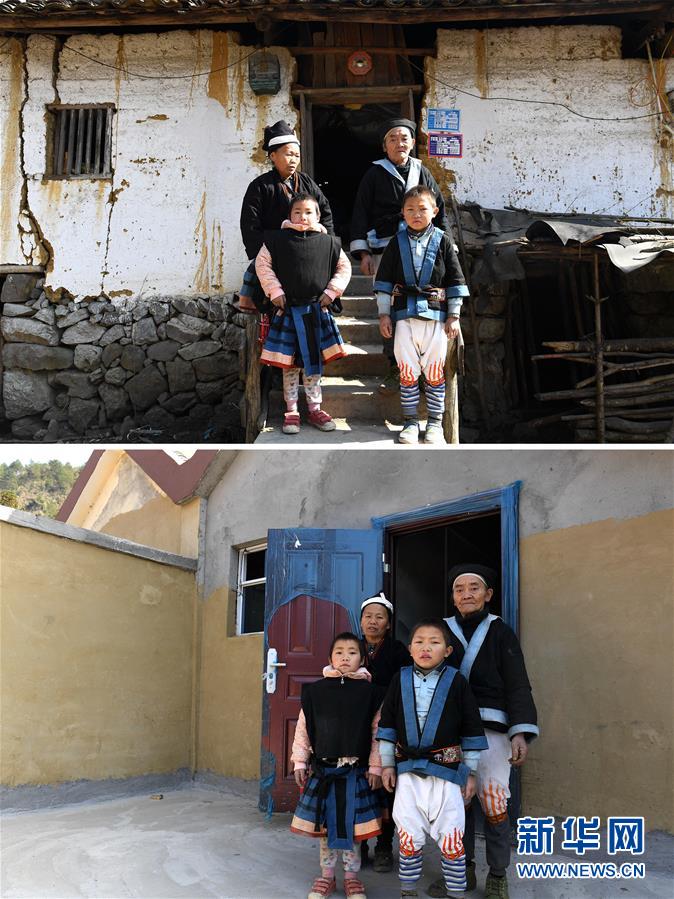 拼版照片:上圖為白褲瑤族同胞韋金林(后排右)與家人在廣西南丹縣里湖瑤族鄉(xiāng)懂甲村搬遷前的老家前(2018年1月11日攝);下圖為韋金林(后排右)與家人在廣西南丹縣里湖瑤族鄉(xiāng)移民集中安置點(diǎn)的新家前(2018年2月5日攝)。新華社記者周華攝