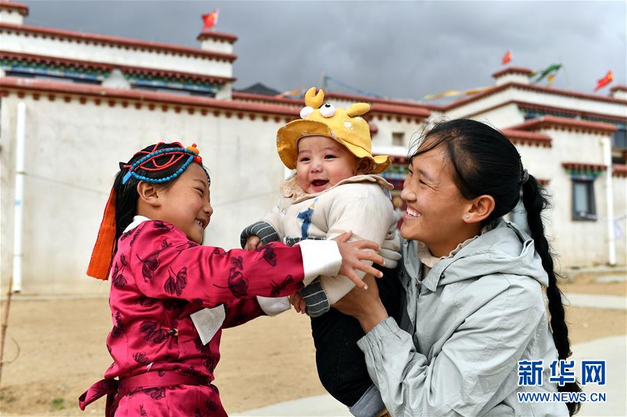 在拉薩市堆龍德慶區(qū)古榮鄉(xiāng)榮瑪高海拔生態(tài)搬遷點,石珍(右)和女兒格桑曲達(dá)(左)、兒子嘎瑪曲英在家門口玩耍(4月1日攝)。石珍是榮瑪高海拔生態(tài)搬遷點醫(yī)務(wù)室的村醫(yī),這份工作每月為她帶來2590元收入。新華社記者 詹彥 攝