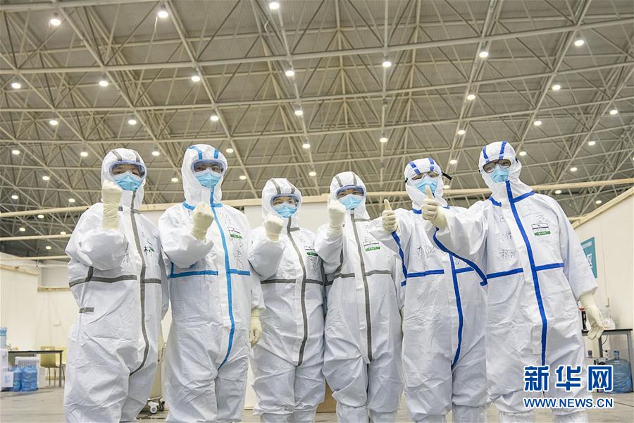 2月10日,在武漢客廳方艙醫(yī)院,幾名醫(yī)護人員為自己打氣。 新華社記者 熊琦 攝