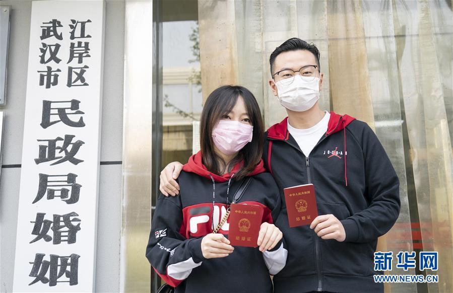 4月7日,在武漢市江岸區(qū)民政局婚姻登記處,陳先生與張女士展示結(jié)婚證。4月3日起,武漢市婚姻登記機(jī)構(gòu)陸續(xù)恢復(fù)辦理婚姻登記業(yè)務(wù)?;橐霎?dāng)事人需持綠色健康碼預(yù)約登記,分批分時辦理。  新華社記者才揚(yáng)攝