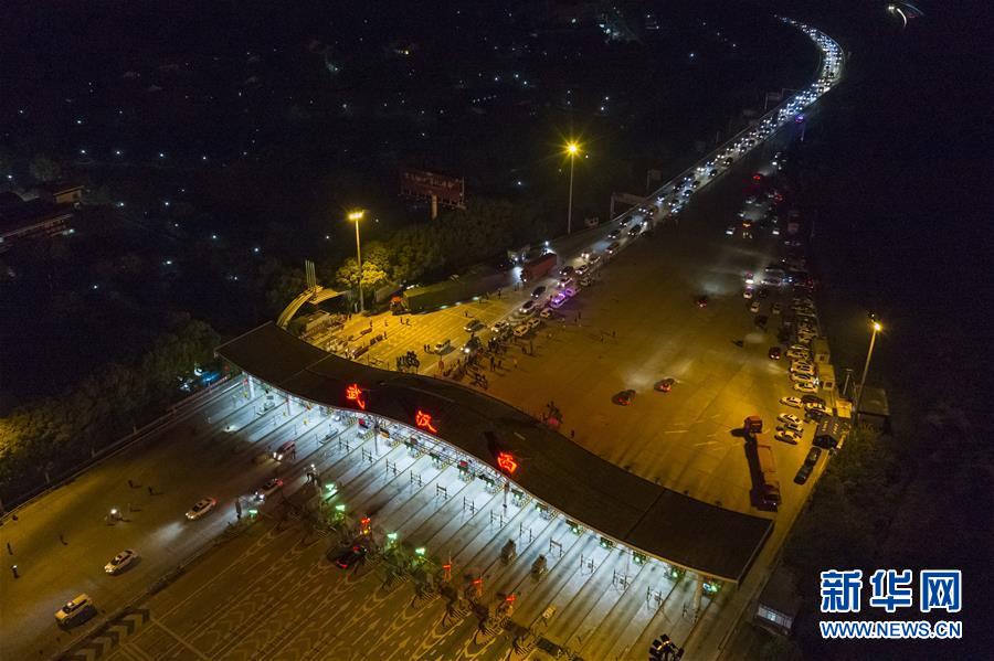 4月8日凌晨,車輛通過(guò)武漢西高速收費(fèi)站(無(wú)人機(jī)拍攝)。 新華社記者 沈伯韓 攝