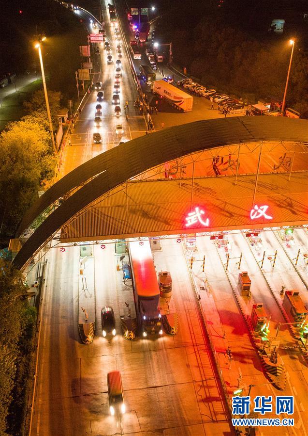 4月8日凌晨,車輛通過(guò)武漢北高速收費(fèi)站(無(wú)人機(jī)照片)。 新華社記者 肖藝九 攝