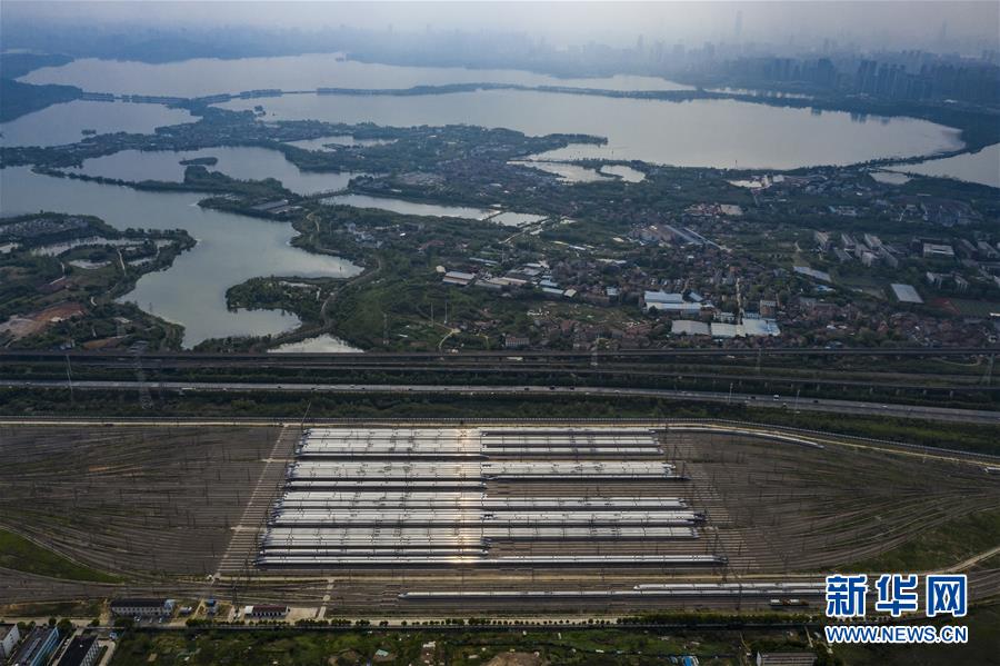 4月7日,在武漢動(dòng)車段,列車??吭诖孳嚲€上(無人機(jī)照片)。