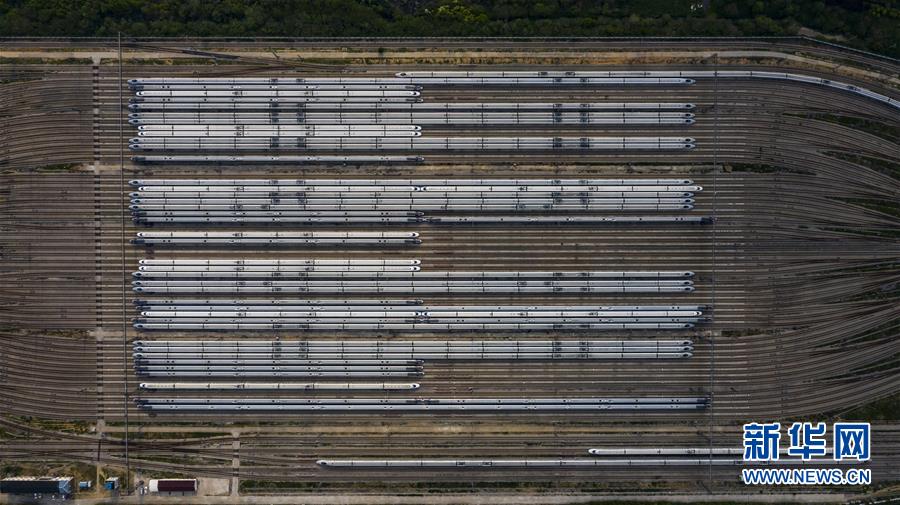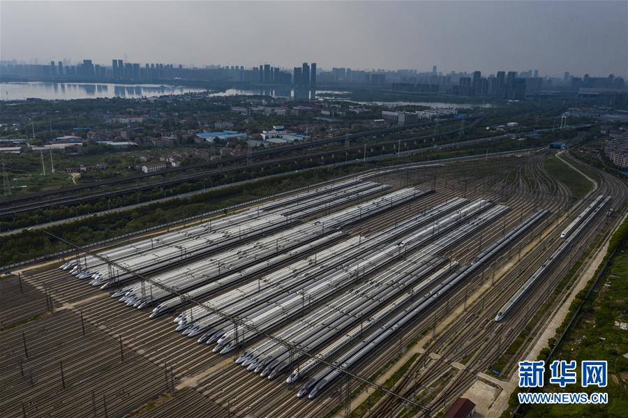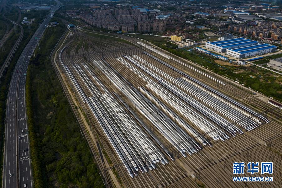 4月7日,在武漢動車段,列車停靠在存車線上(無人機照片)。新華社記者 沈伯韓 攝