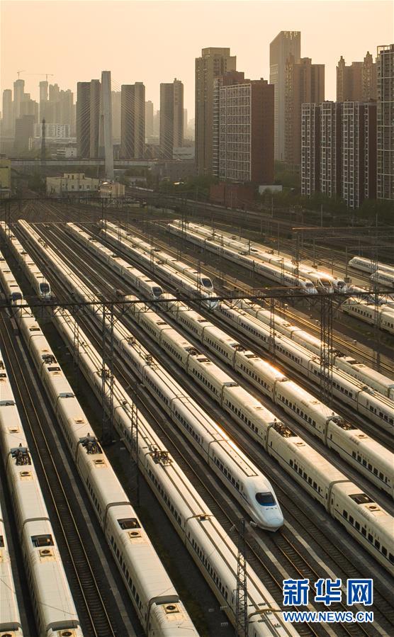 4月7日,在武漢動車段,列車??吭诖孳嚲€上(無人機照片)。