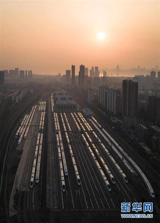4月8日,在武漢動車段,列車停靠在存車線上準備投入運行(無人機照片)。當日,武漢市正式解除離漢離鄂通道管控措施,幾十組在武漢動車段經(jīng)過檢修消殺的動車組,猶如“陸地艦隊”??吭诖孳嚲€上,蓄勢待發(fā),重新啟程。 新華社記者 肖藝九 攝