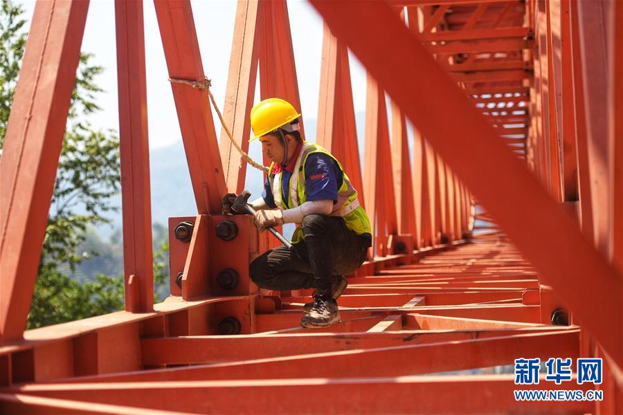 4月8日,兩名中鐵四局職工安裝架設(shè)鋼桁梁,每節(jié)鋼桁梁間的精度需要達(dá)到毫米級(jí)才能保證安裝到位。新華社記者江文耀攝