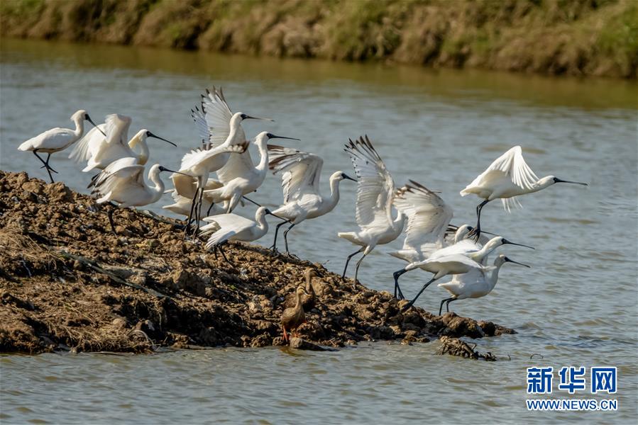 這是在福建閩江口濕地拍攝的黑臉琵鷺(4月12日攝)。新華社記者梅永存攝