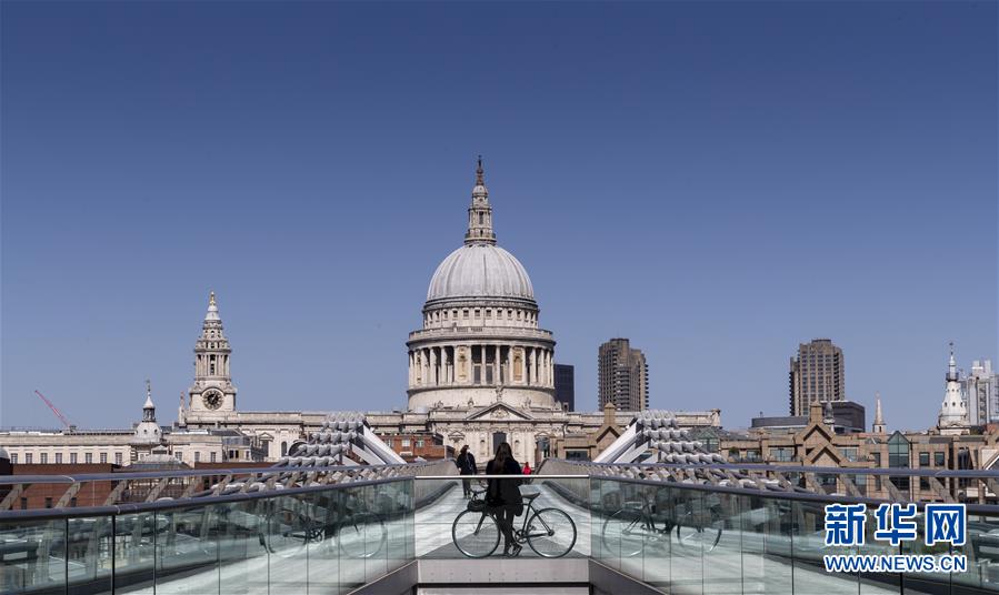 4月14日,一名女子在英國倫敦的千禧橋上駐足,眺望遠(yuǎn)處的圣保羅大教堂。新華社記者韓巖攝