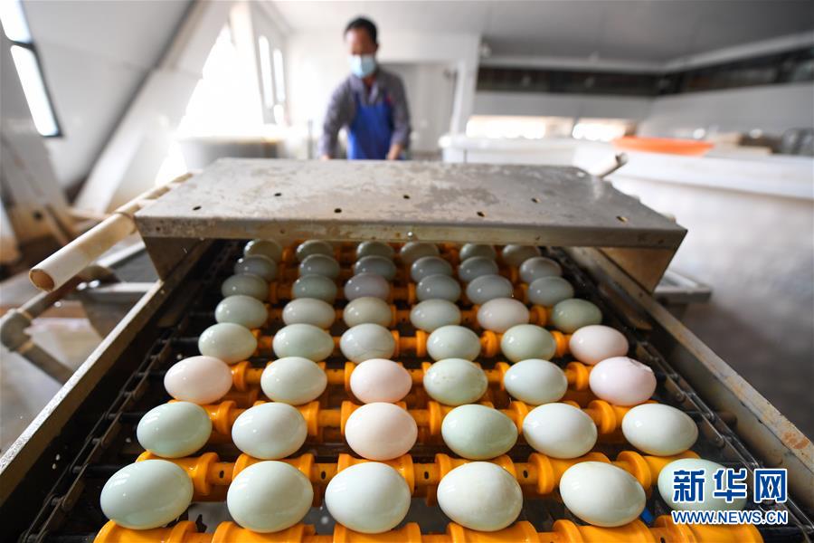 江蘇高郵鴨集團的工作人員將腌制好的鴨蛋放到塑封包裝流水線上(4月15日攝)?!案哙]鴨蛋”是江蘇高郵的特色農業(yè)名片。近年來,當地在良種繁育、生態(tài)養(yǎng)殖、產品加工等方面加大力度,推動高郵鴨蛋品牌化建設,讓小鴨蛋成為帶動農戶致富的大產業(yè)。2019年,高郵市共計生產熟制鴨蛋產品近11.2億枚,年產值近17.68億元。新華社記者李博攝
