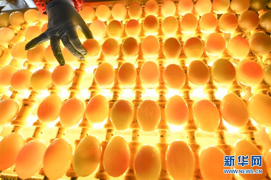 江蘇高郵鴨集團(tuán)的工作人員在生產(chǎn)線上對(duì)鴨蛋進(jìn)行光檢作業(yè)(4月15日攝)?!案哙]鴨蛋”是江蘇高郵的特色農(nóng)業(yè)名片。近年來(lái),當(dāng)?shù)卦诹挤N繁育、生態(tài)養(yǎng)殖、產(chǎn)品加工等方面加大力度,推動(dòng)高郵鴨蛋品牌化建設(shè),讓小鴨蛋成為帶動(dòng)農(nóng)戶致富的大產(chǎn)業(yè)。2019年,高郵市共計(jì)生產(chǎn)熟制鴨蛋產(chǎn)品近11.2億枚,年產(chǎn)值近17.68億元。新華社記者李博攝