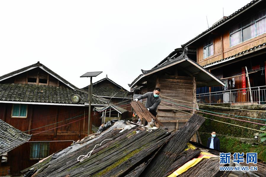貴州省從江縣加榜鄉(xiāng)黨扭村村民在整治吊腳樓風貌(4月16日攝)。貴州省從江縣把人居環(huán)境整治作為脫貧攻堅工作的一項重要舉措來抓,對鄉(xiāng)村規(guī)劃范圍內(nèi)長期無人居住的危房、廢棄禾倉、棚圈、柴草房和房前屋后的殘垣斷壁等進行清理整治,進行復墾復綠,同時開展農(nóng)戶衛(wèi)生和村寨環(huán)境整治,做到鄉(xiāng)村環(huán)境干凈、衛(wèi)生、整潔,扮靚美麗鄉(xiāng)村。新華社記者楊文斌攝