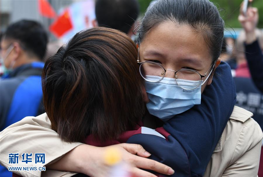 4月21日,在四川大學(xué)華西醫(yī)院,醫(yī)療隊隊員和家人相互擁抱。當(dāng)日,來自四川大學(xué)華西醫(yī)院、華西第二醫(yī)院、華西第四醫(yī)院的醫(yī)療隊隊員解除隔離休整,與分別許久的家人、同事團聚,緊緊相擁。新華社記者王曦攝