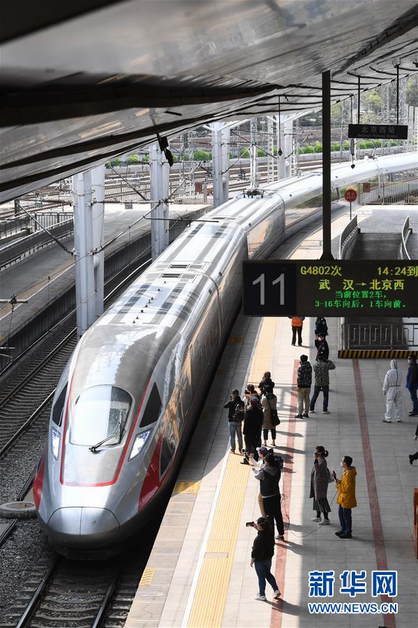 4月8日,G4802次列車駛?cè)氡本┪髡?。當日,武漢市正式解除離漢離鄂通道管控措施,首趟武漢返京列車G4802次列車抵達北京西站。新華社記者鞠煥宗攝