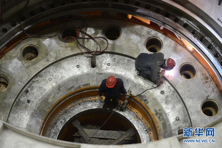 4月24日,工人在施工現(xiàn)場(chǎng)進(jìn)行機(jī)組底環(huán)與錐管焊縫打磨作業(yè)。新華社記者韓曉雨攝