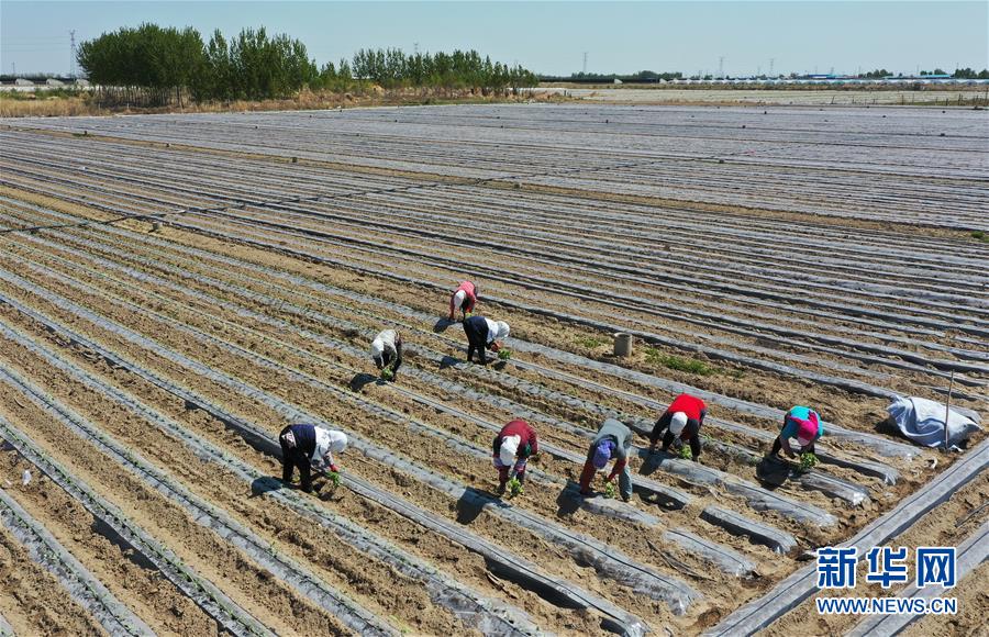 4月25日,灤南縣東黃坨鎮(zhèn)新戶村農(nóng)民在田間栽植煙薯秧苗(無人機(jī)照片)。近年來,河北省灤南縣利用當(dāng)?shù)赝寥篮蜌夂蛱攸c(diǎn),引導(dǎo)農(nóng)民因地制宜發(fā)展煙薯種植,取得良好效果。目前該縣煙薯種植面積達(dá)3萬多畝,每畝年收入達(dá)5000多元。新華社記者楊世堯攝