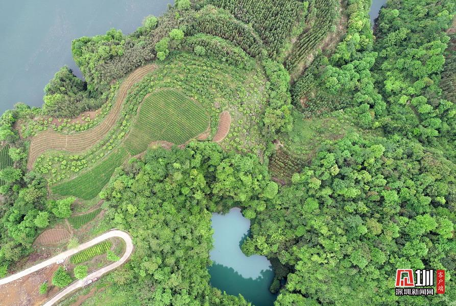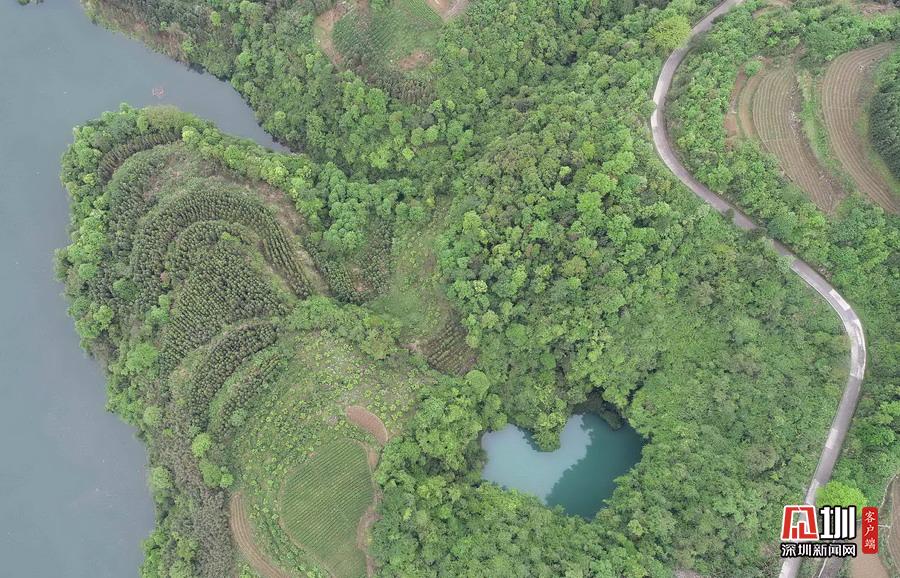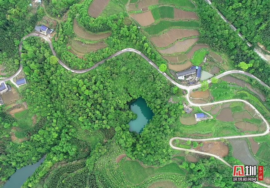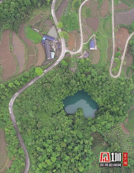 2020年4月24日,在湖南張家界市永定區(qū)“百里畫廊”茅巖河景區(qū)拍攝的“天坑心湖”。(無人機(jī)拍攝)