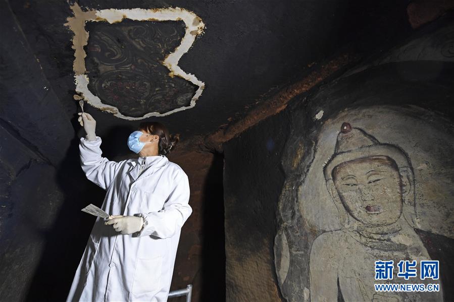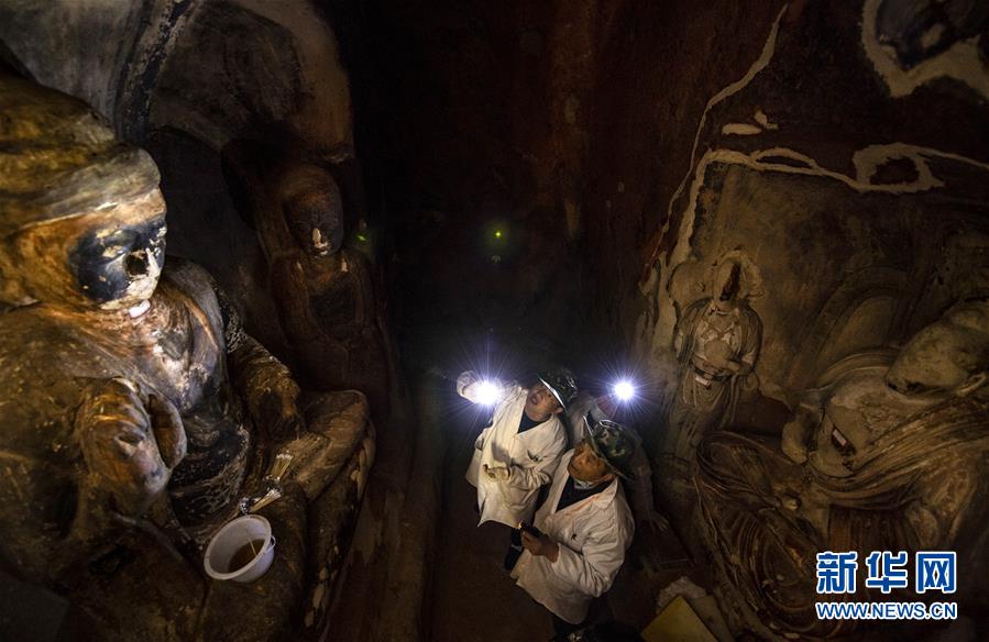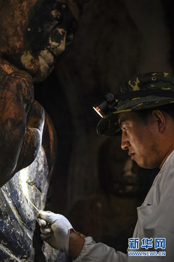 4月27日,文物修復專家在寧夏須彌山石窟圓光寺48號窟內開展修復工作。新華社記者馮開華攝