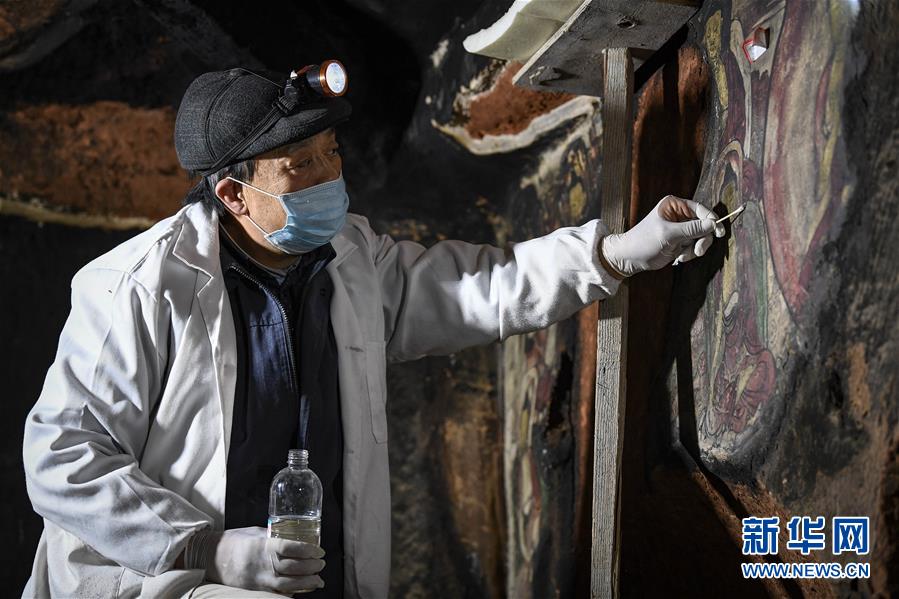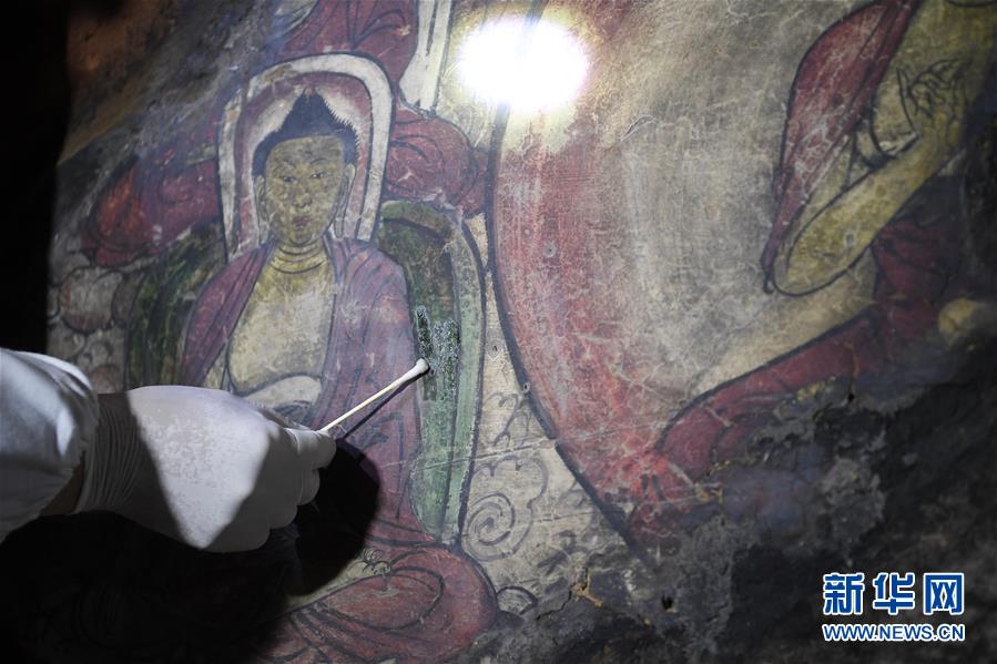 4月27日,文物修復專家在寧夏須彌山石窟圓光寺48號窟內修復壁畫。新華社記者王鵬攝
