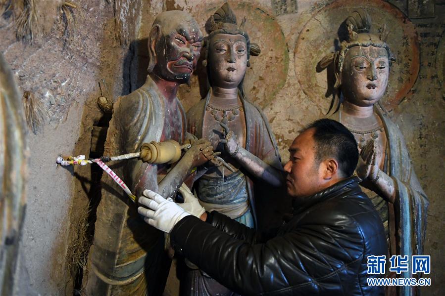 12月25日,在麥積山石窟第11窟,修復師牟常有對塑像破損處進行加固處理。