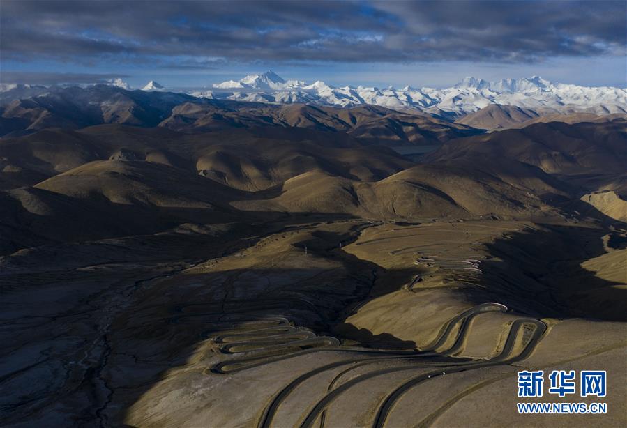 日出時分,在加烏拉山口拍攝的前往珠峰的道路(4月25日攝)。新華社記者普布扎西攝