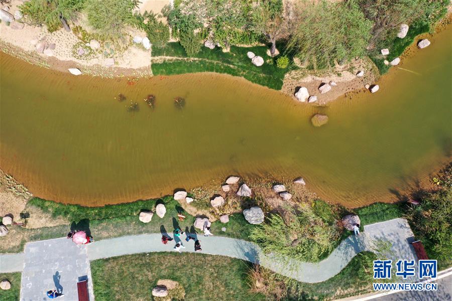 5月1日,游客在河南省鶴壁市淇濱區(qū)鉅橋鎮(zhèn)崗坡村的水系旁游玩(無(wú)人機(jī)照片)。 新華社記者馮大鵬攝