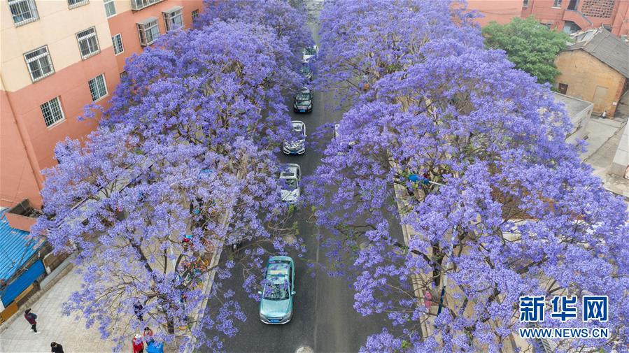 這是5月2日在昆明市教場中路拍攝的藍花楹(無人機照片)。近日,云南省昆明市部分街區(qū)的藍花楹競相開放,為春城增添靚麗風景。新華社記者藺以光攝