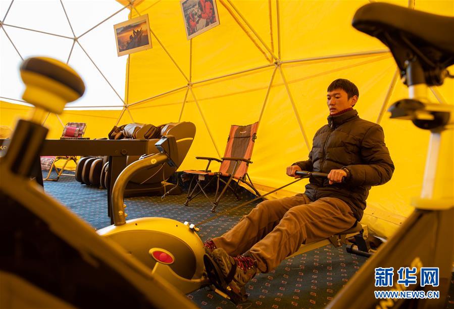 登山隊(duì)員在珠峰大本營內(nèi)健身(5月1日攝)。新華社記者晉美多吉攝