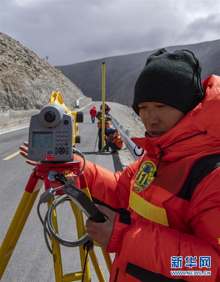 國(guó)測(cè)一大隊(duì)隊(duì)員在西藏定日縣曲當(dāng)鄉(xiāng)境內(nèi)進(jìn)行水準(zhǔn)測(cè)量(4月18日攝)。水準(zhǔn)測(cè)量是一種利用提供水平視線的儀器(如水準(zhǔn)儀、水準(zhǔn)標(biāo)尺),測(cè)定地面不同點(diǎn)之間的高差,并以此推算高度的一種方法,是經(jīng)典大地測(cè)量的重要技術(shù)之一。在目前正在進(jìn)行的2020珠峰高程測(cè)量中,部分國(guó)測(cè)一大隊(duì)隊(duì)員承擔(dān)了水準(zhǔn)測(cè)量的任務(wù)。新華社記者孫非攝