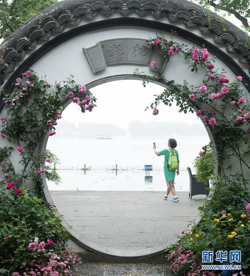5月5日,游客在西湖畔的郭莊觀看月季花展?!拔逡弧逼陂g,第八屆杭州西湖月季花精品展在杭州西子湖畔舉行,展出國內外700余個月季品種。新華社記者翁忻旸攝