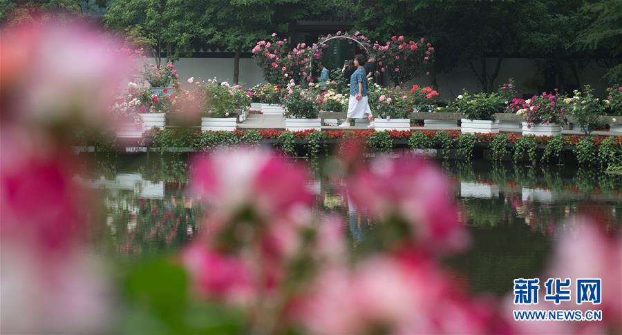 5月5日,游客在西湖畔的郭莊觀看月季花展?!拔逡弧逼陂g,第八屆杭州西湖月季花精品展在杭州西子湖畔舉行,展出國內(nèi)外700余個(gè)月季品種。新華社記者翁忻旸攝