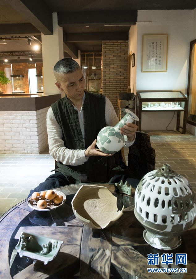 5月8日,項(xiàng)宏金在龍泉青瓷裝飾紋樣研究所查看自己收藏的一些古瓷器。1965年出生的項(xiàng)宏金,被浙江龍泉年輕一代瓷人稱為“項(xiàng)哥”,他從20世紀(jì)90年代開始收集龍泉青瓷標(biāo)本,研究青瓷紋樣。2014年出版著作《龍泉青瓷裝飾紋樣》,次年開設(shè)龍泉青瓷裝飾紋樣研究所,將自己收藏的千余件標(biāo)本跟瓷器愛好者、創(chuàng)作者免費(fèi)分享。新華社記者翁忻旸攝