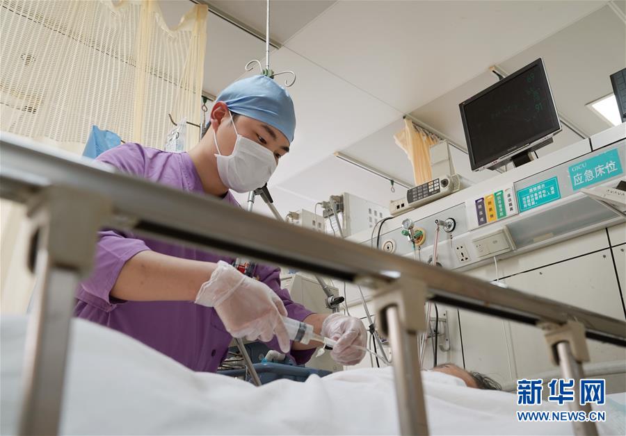 5月10日,在上海市普陀區(qū)中心醫(yī)院急診重癥監(jiān)護室內,23歲的護士范磊磊為患者進行鼻飼。男護士團隊中的絕大多數(shù)護士是“90后”。