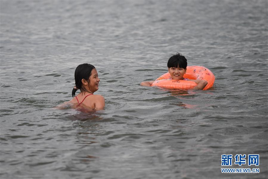 5月10日,市民在??谖餍愫┖S驊蛩?。近日,??诔掷m(xù)高溫,不少市民前往海灘戲水消暑。新華社記者蒲曉旭攝