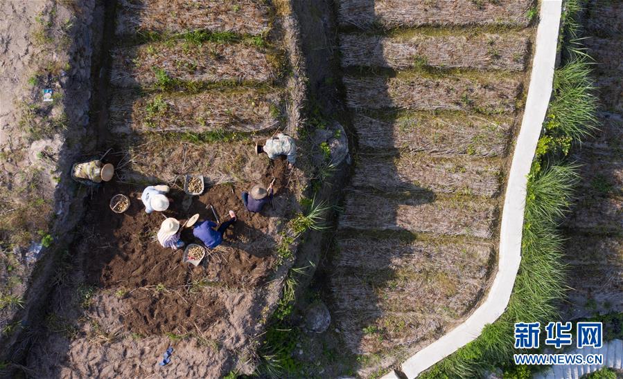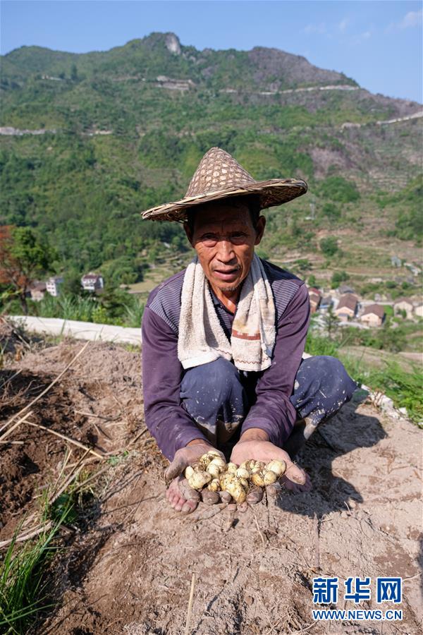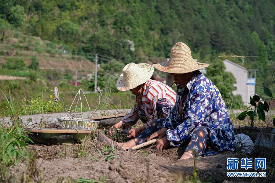 5月12日,青田縣巨浦鄉(xiāng)西坑村的村民在梯田收獲中藥貝母。當(dāng)?shù)夭扇『献魃缂懈N,冬春種中藥、夏秋種養(yǎng)水稻和田魚的方式,全面提升土地利用率和收益。新華社記者徐昱攝