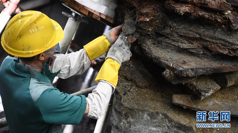 這是位于廣東陽江海陵島的“南海I號(hào)”已清理出的船艉部分(5月12日攝)。新華社記者鄧華攝