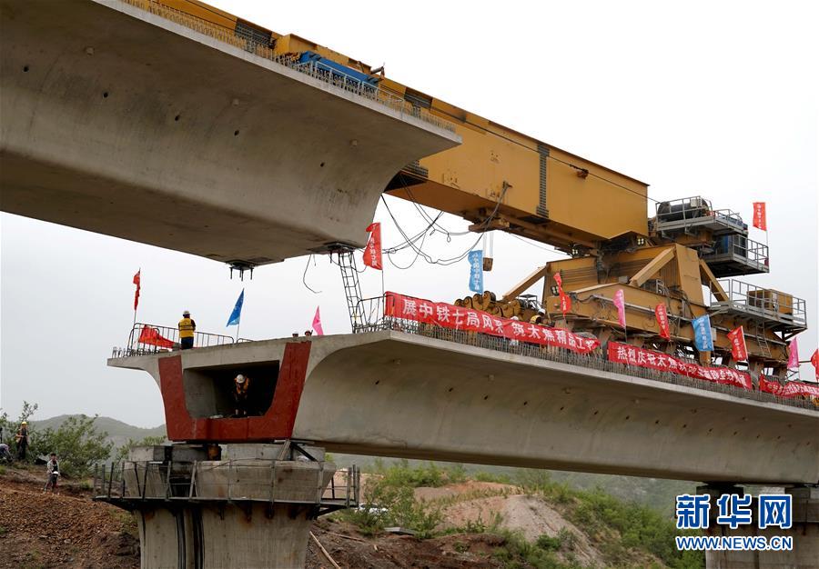 5月13日,運(yùn)架一體機(jī)在位于河南焦作的施工現(xiàn)場(chǎng)進(jìn)行架梁作業(yè)。 當(dāng)日,隨著最后一榀長(zhǎng)24米、重552噸的箱梁架設(shè)就位,太焦高鐵全線橋梁架設(shè)完成。從山西太原到河南焦作的太焦高鐵是國(guó)家規(guī)劃建設(shè)的“八縱八橫”高速鐵路網(wǎng)的重要組成部分,計(jì)劃2020年底建成通車。 新華社記者李安攝