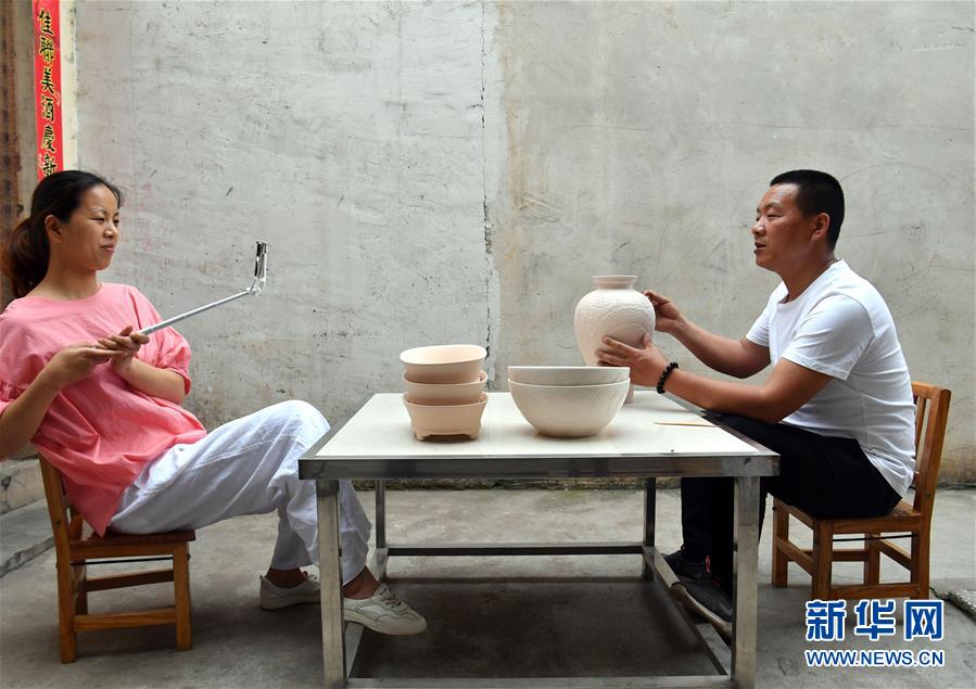 5月13日,寶豐縣大營鎮(zhèn)的汝瓷藝人宋召冰在汝瓷作坊直播介紹汝瓷產(chǎn)品。新華社記者李嘉南攝