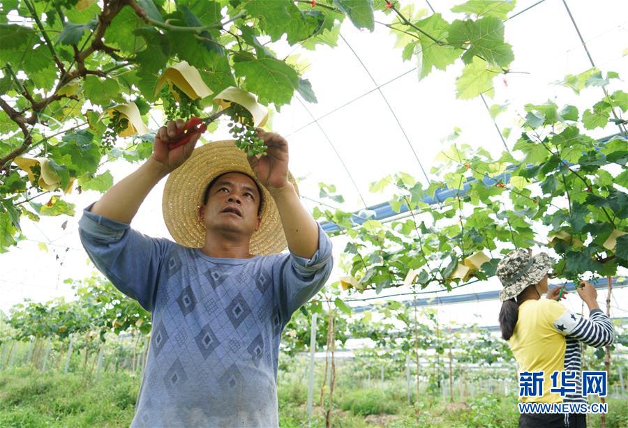 5月13日,在福建省建甌市小橋鎮(zhèn)陽澤村誠源果蔬專業(yè)合作社,村民在修剪葡萄枝葉。誠源果蔬專業(yè)合作社有葡萄園100多畝,產(chǎn)品供應(yīng)北京上海市場,村民可以在葡萄園內(nèi)從事季節(jié)性工作。新華社記者賀燦鈴攝