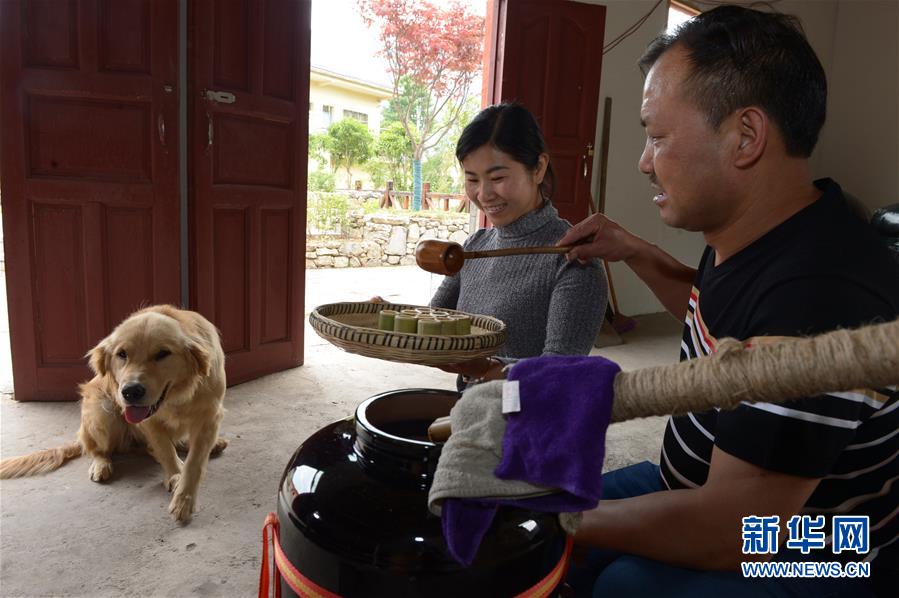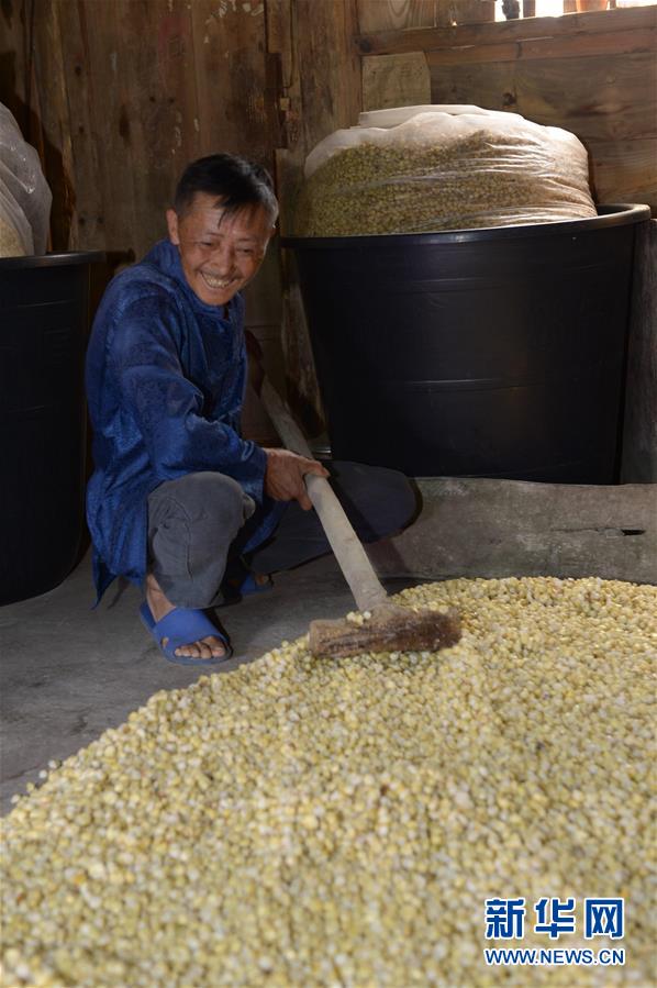 5月14日,在貴州省畢節(jié)市百里杜鵑管理區(qū)黃泥鄉(xiāng)龍?zhí)链逡患揖谱鞣?,村民?duì)玉米進(jìn)行發(fā)酵。貴州省畢節(jié)市百里杜鵑管理區(qū)黃泥鄉(xiāng)龍?zhí)链宓凝執(zhí)凉啪疲颡?dú)特的古法釀酒技術(shù),口感獨(dú)特而遠(yuǎn)近聞名。全村有釀酒戶142戶,年產(chǎn)量達(dá)45萬多公斤,龍?zhí)凉啪七h(yuǎn)銷重慶、廣東、浙江等地,龍?zhí)凉啪埔殉蔀辇執(zhí)寥嗽鍪盏闹匾獊碓?。新華社記者楊楹攝