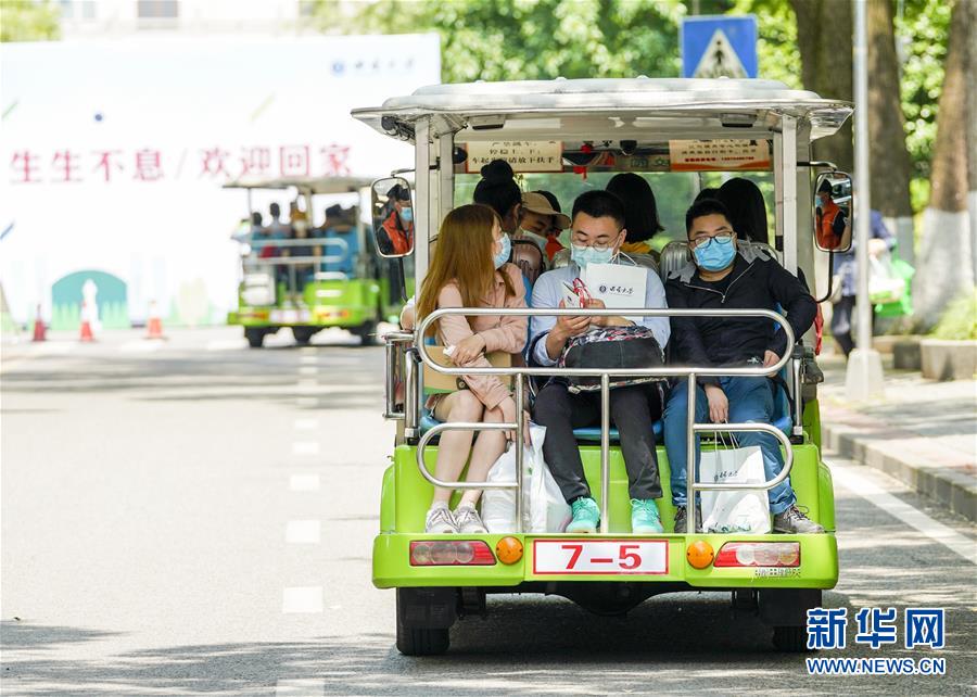 5月15日,在西南大學(xué)校園內(nèi),學(xué)生們搭乘校內(nèi)轉(zhuǎn)運(yùn)車前往各自的宿舍。當(dāng)日,重慶西南大學(xué)迎來(lái)疫情以來(lái)首批返校大學(xué)生。據(jù)介紹,按照疫情防控的需要,重慶市高校2020年春季學(xué)期從5月11日起按照“一校一策”原則,實(shí)行錯(cuò)峰錯(cuò)時(shí)分批次有序開學(xué)復(fù)課。新華社記者劉潺攝