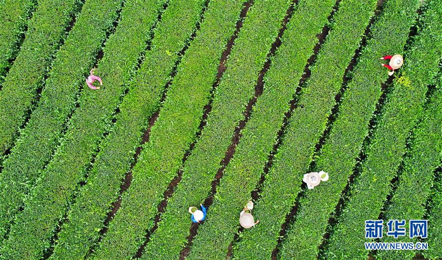 5月17日,村民在新院村茶葉基地采摘夏茶(無(wú)人機(jī)照片)。新華社記者王全超攝