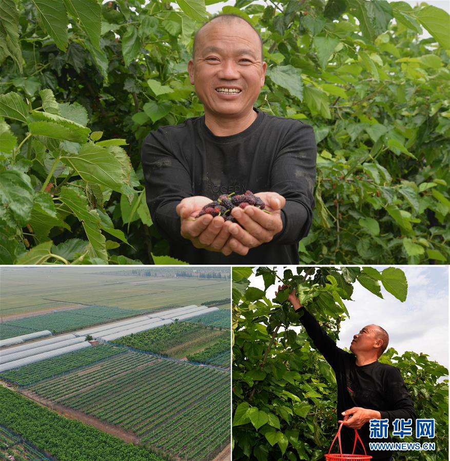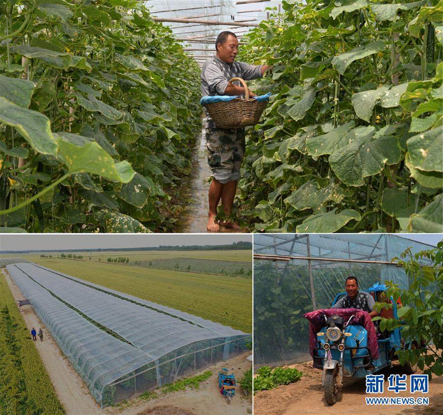 這是一張拼版照片(圖片均為5月16日攝)。上圖:在河南省開封市尉氏縣大橋鄉(xiāng)馮村,50歲的文海軍在他的黃瓜種植大棚內采摘黃瓜;下左圖:在扶貧政策扶持下,文海軍蓋了占地6畝的蔬菜溫室大棚(無人機照片);下右圖:文海軍駕駛三輪車運輸采摘的黃瓜。新華社記者孫清清攝